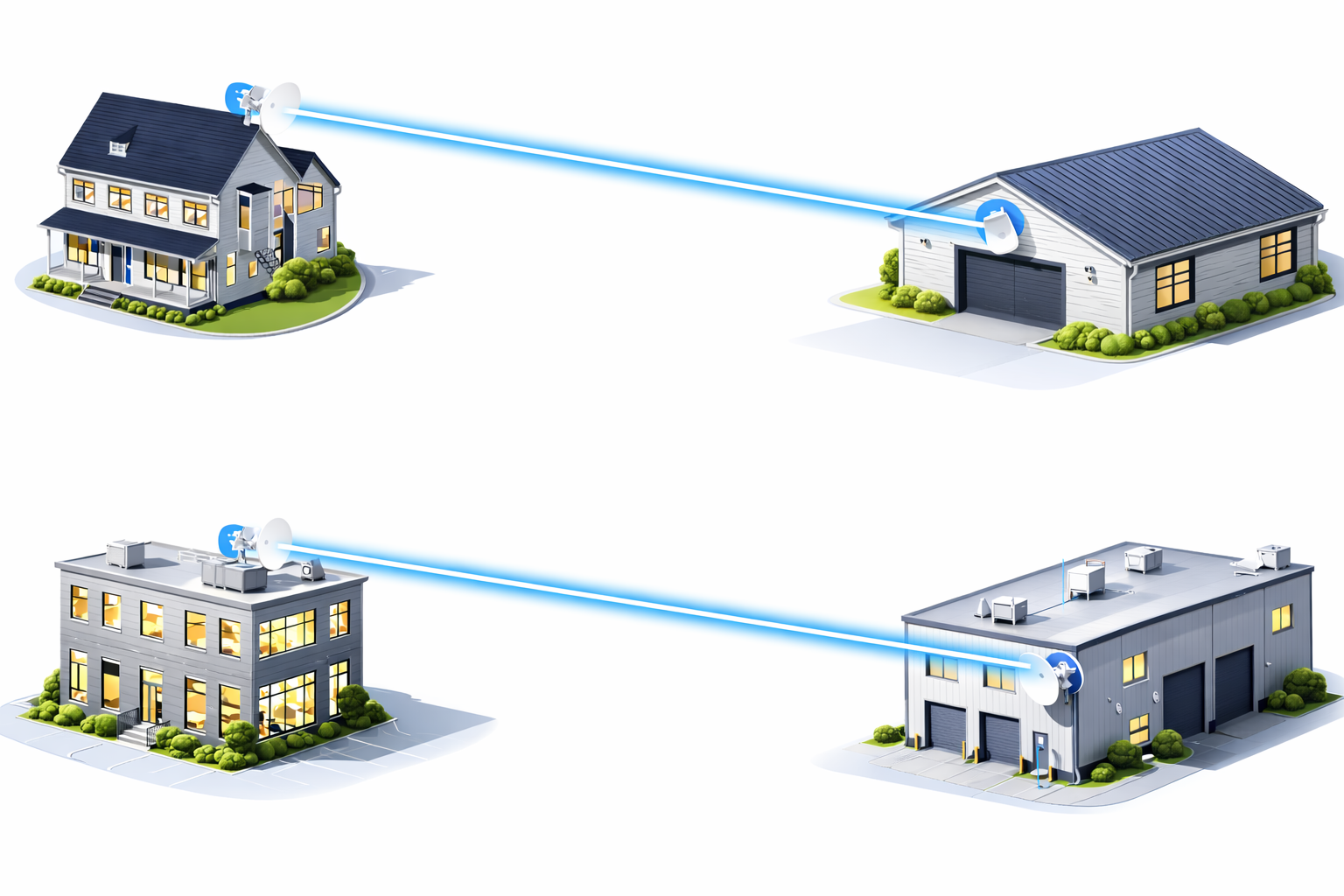 Using secure high-speed wireless links, we can connect separate buildings so they operate as one unified network. Homes, garages, offices, warehouses, and outbuildings can all share the same internet connection, cameras, phones, and network resources without trenching or major construction.